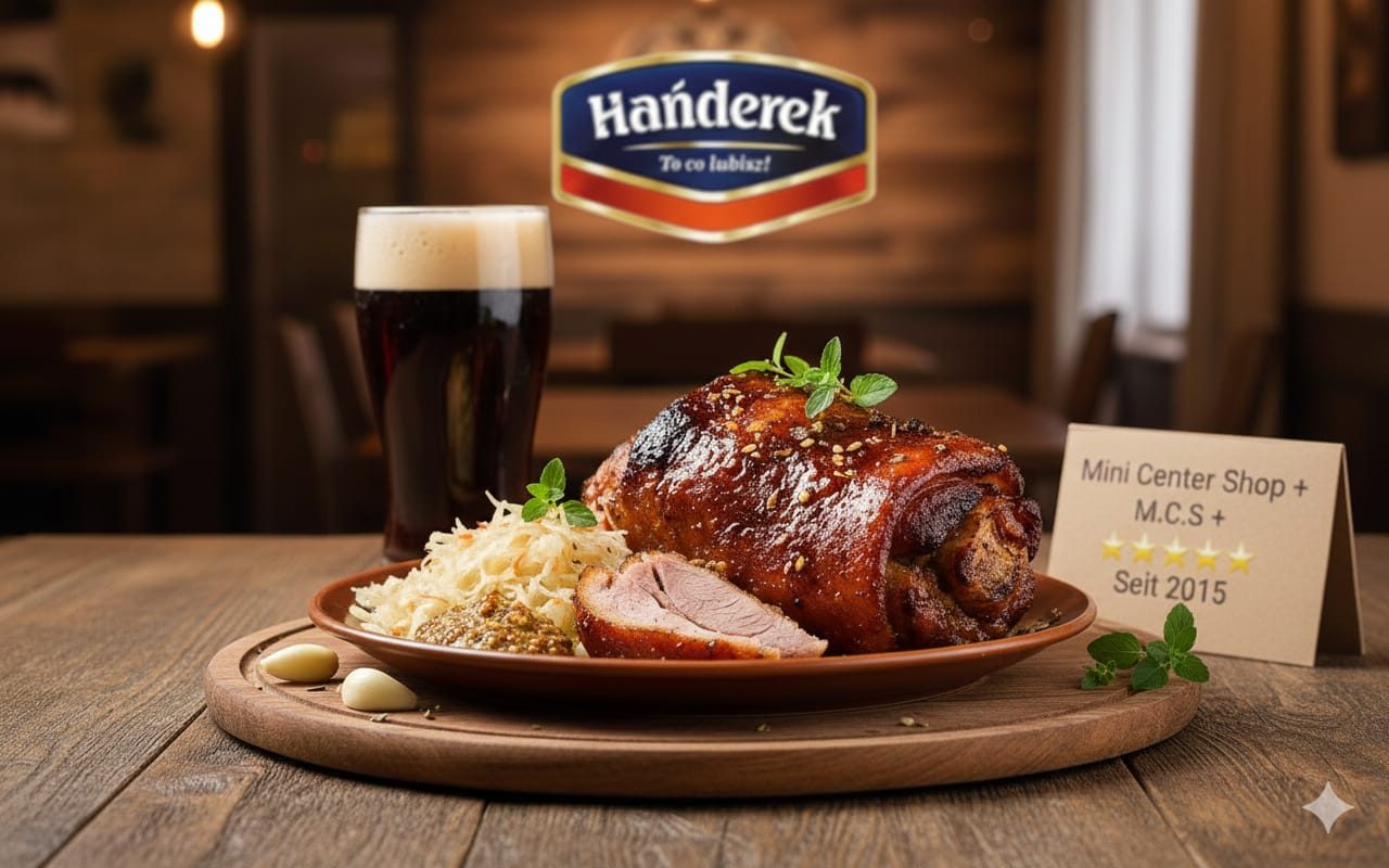 Servieren Sie das duftende, glasierte Golonko (Eisbein) heiß. Die süß-würzige Kruste harmoniert perfekt mit der Säure von frischem Sauerkraut (Kapusta Kiszona) (erhältlich bei MINI CENTER SHOP +) und einem Klecks kräftigem Senf. Perfekt als Alternative zum traditionellen Schweinebraten!