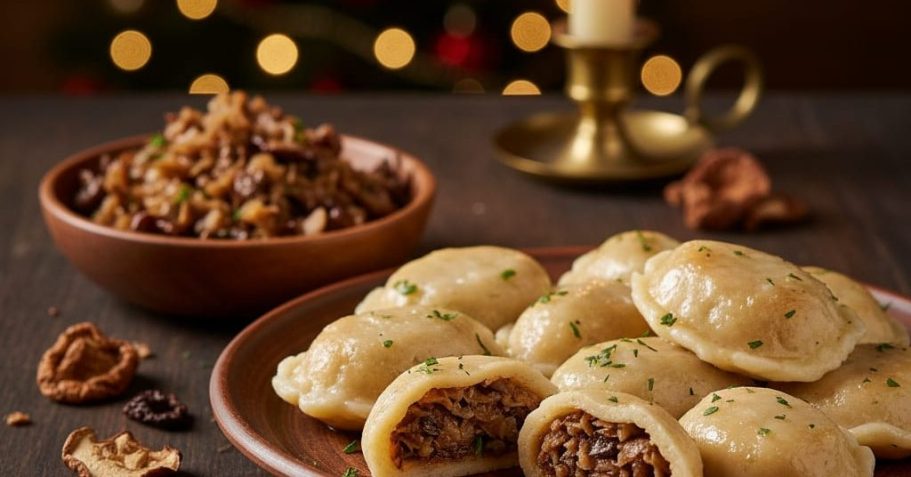 Uszka sind die kleinen, pilzgefüllten Teigtaschen, die traditionell in der klaren Roten Bete Suppe (Barszcz) serviert werden. Sie sind das Herzstück des polnischen Heiligen Abends (Wigilia). Die Füllung aus getrockneten Waldpilzen und gebratener Zwiebel sorgt für ein tiefes, erdiges Aroma, das perfekt zur würzigen Suppe passt. Sie symbolisieren die festliche Gemütlichkeit am polnischen Weihnachtstisch.