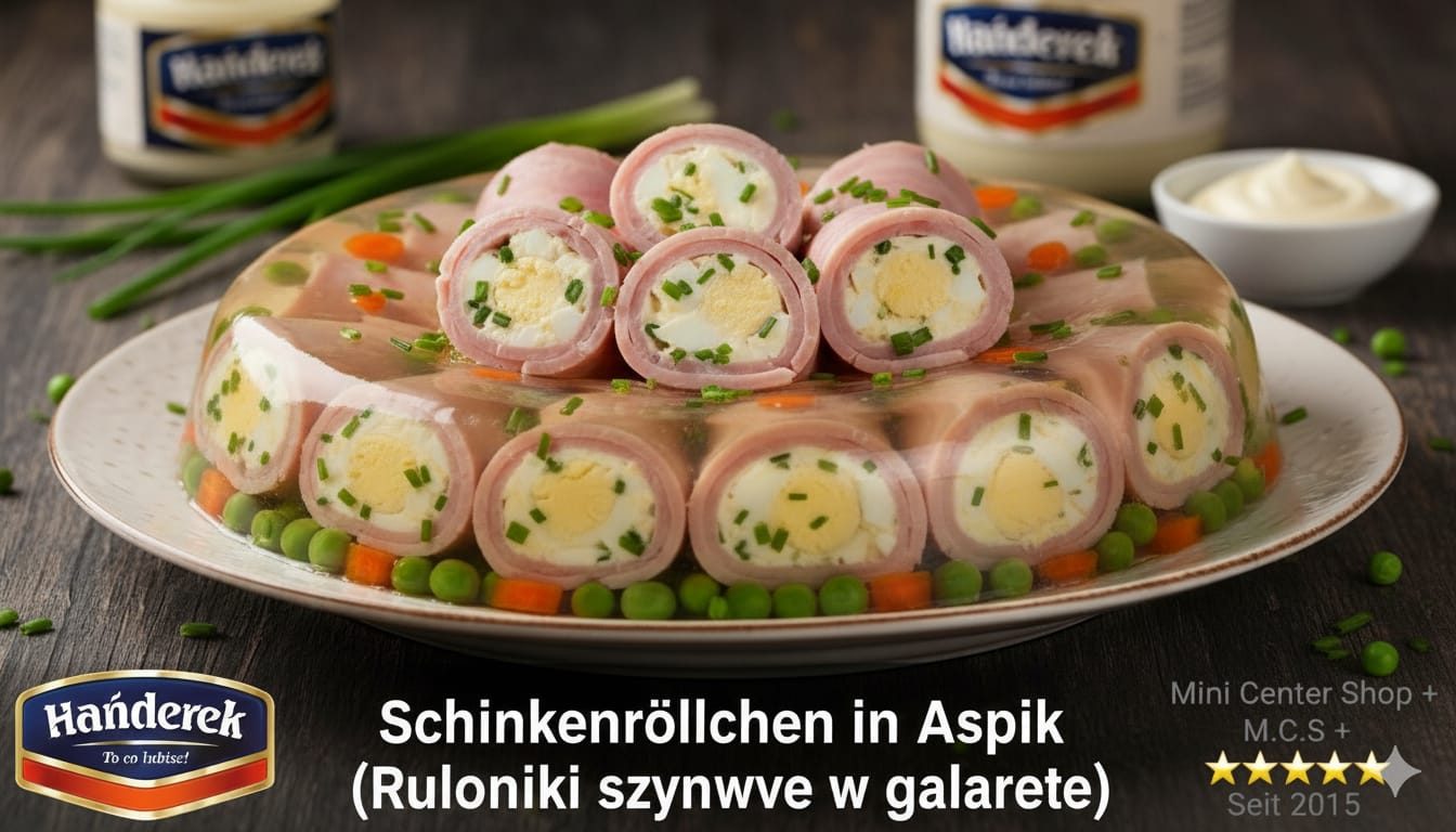 🍽 Servierempfehlung: Servieren Sie die Röllchen eisgekühlt auf einem frischen Salatbett oder garniert mit unserem scharfen Meerrettich (Kren) aus dem Sortiment von Mini Center Shop +. Die kühle, zarte Textur des Aspiks harmoniert perfekt mit der Würze der Füllung. Ein idealer Blickfang, der sowohl als elegante Vorspeise als auch als raffinierter Bestandteil einer polnischen Feinkostplatte überzeugt.